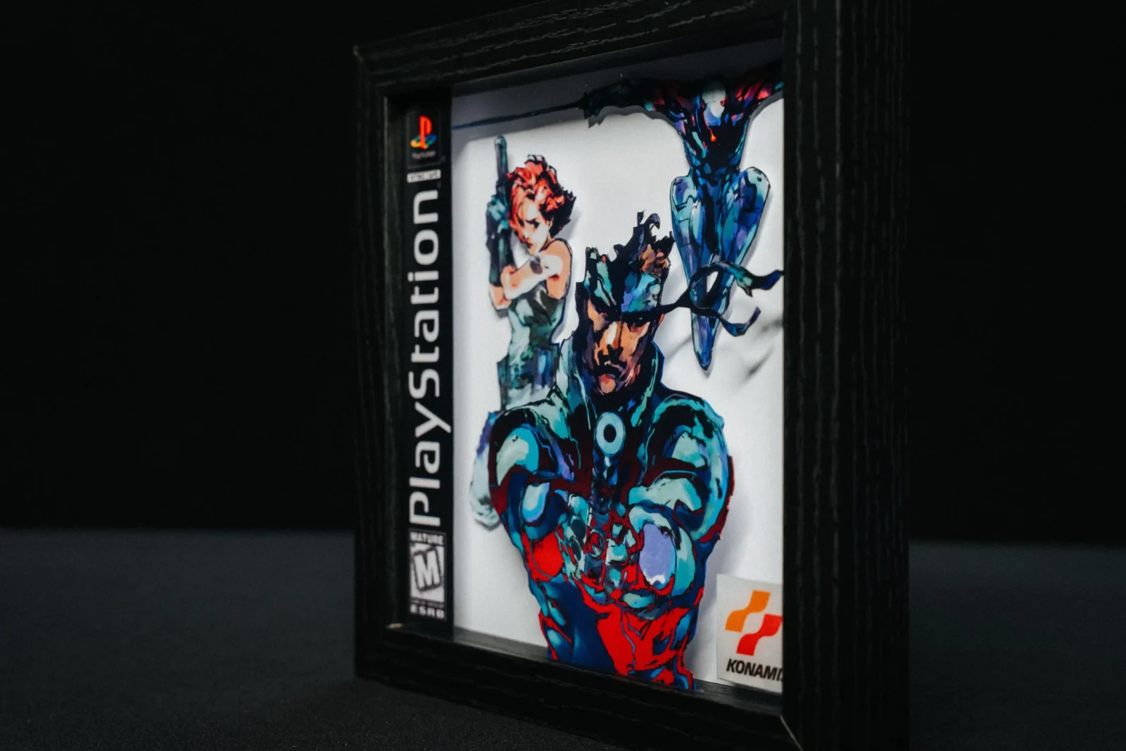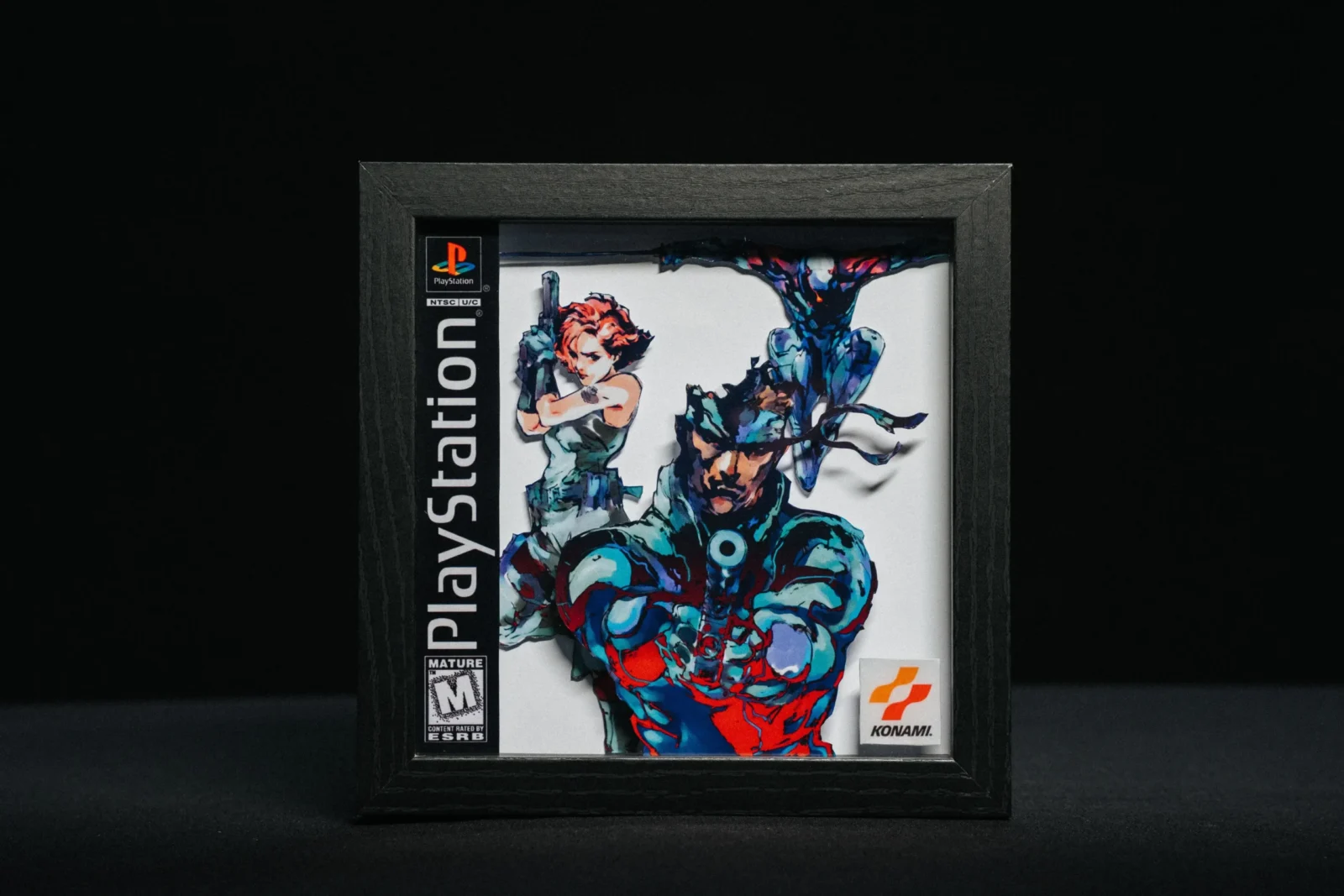- 1 ShadowBox Metal Gear Solid con marco de madera negro mate.